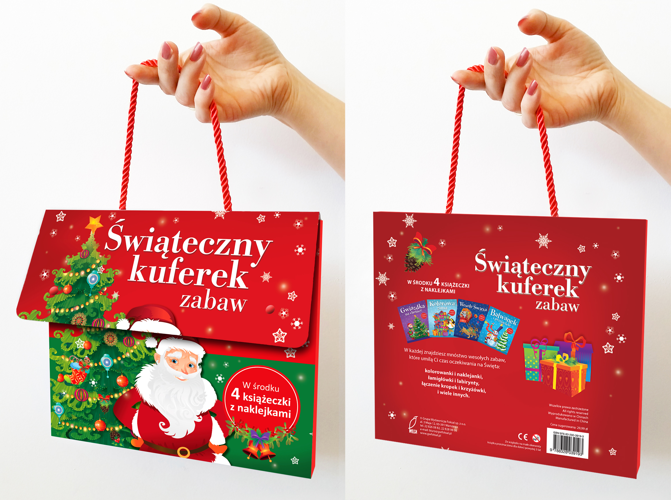 Poznajcie mądre i wzruszające historie: Pinokia, Czerwonego Kapturka, Kopciuszka, Królewny Śnieżki i bawcie się kolorowymi naklejkami. W drugim kuferku czekają na was cztery książeczki z naklejkami, pełne kolorowanek i łamigłówek, które umilą czas oczekiwania na Święta.