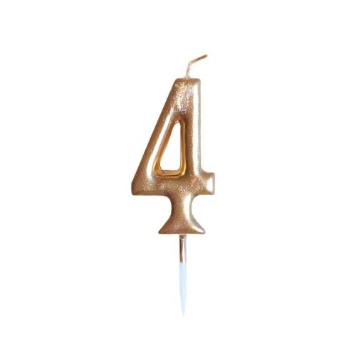 Świeczka metalizowana złota "4", na pikerze, Wysokość świeczki 6 cm, wysokość z pikerem 8 cm.