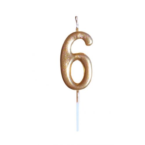 Świeczka metalizowana złota "6", na pikerze. Wysokość świeczki 6 cm, wysokość z pikerem 8 cm.