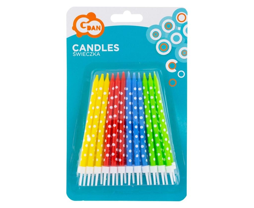Opis produktuZasady bezpieczeństwaŚwieczki urodzinowa na tort Świeczki urodzinowe, super dekoracja na tort dziecka Świeczki w 4 kolorach ozdobione białymi grochami W opakowaniu znajdują się 24 sztuki. x