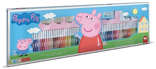 Pieczątki na licencji Świnka Peppa. W skład zestawu wchodzą: 4 pieczątki, 1 poduszeczka do tuszu, 60 pisaków, 1 książeczka do kolorowania i 30 naklejek.