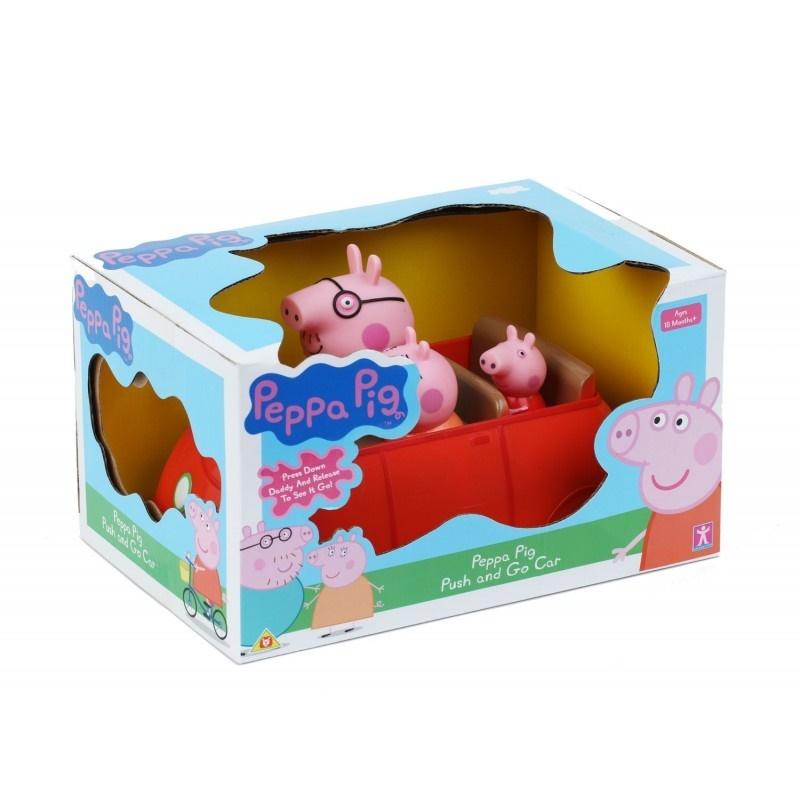 Świnka Peppa - Duży samochód z rodzinką Pusz n Go 05130. Rodzinne autko Peppy wraz z tatą i mamą świnką oraz Peppą na tylnym siedzeniu zachwyci dzieci, które pokochały tę zabawną rodzinkę. Pojazd, po naciśnięciu na figurkę taty, zaczyna jechać do przodu. Zestaw zawiera 3 figurki i stanowi wspaniałe uzupełnienie całej linii zabawek z kolekcji. Cechy produktu: samochód rodzinny wprawiany jest w ruch po naciśnięciu na figurkę taty 3 figurki: mama, tata, świnka Peppa x