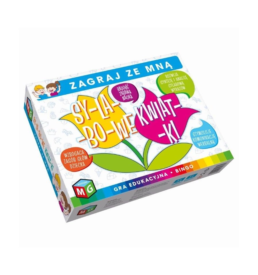 Opis produktuZasady bezpieczeństwaSylabowe kwiatki to dydaktyczna wersja gry bingo. Gra rozwija umiejętności dokonywania syntezy i analizy sylabowej wyrazów 2- i 3- sylabowych oraz wzbogaca słownik dziecka. Dzięki przyjemnym i prostym ilustracjom, uwaga graczy jest skupiona na zabawie. Gra ćwiczy spostrzegawczość, skupienie i pamięć oraz stymuluje komunikację werbalną. Doskonale przygotowuje dziecko do nauki czytania i pisania. Celem gry jest jak najszybsze skompletowanie żetonów, które zakryją obrazki widoczne na kolorowych kwiatkach. Zawartość opakowania: