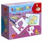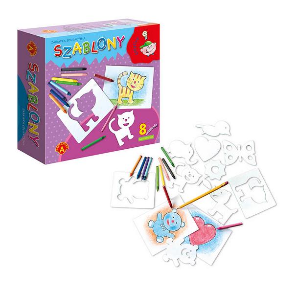 " SZABLONY" to zabawka , która składa się z 8 szablonów( w pozytywie i negatywie). Szablony przedstawiają 8 róznych sylwetek ( np.psa, kota itp.) Dzięki nim dziecko może w łatwy sposób narysować wybraną sylwetkę wzbogacając ją kolorem i dodatkowymi elementami.