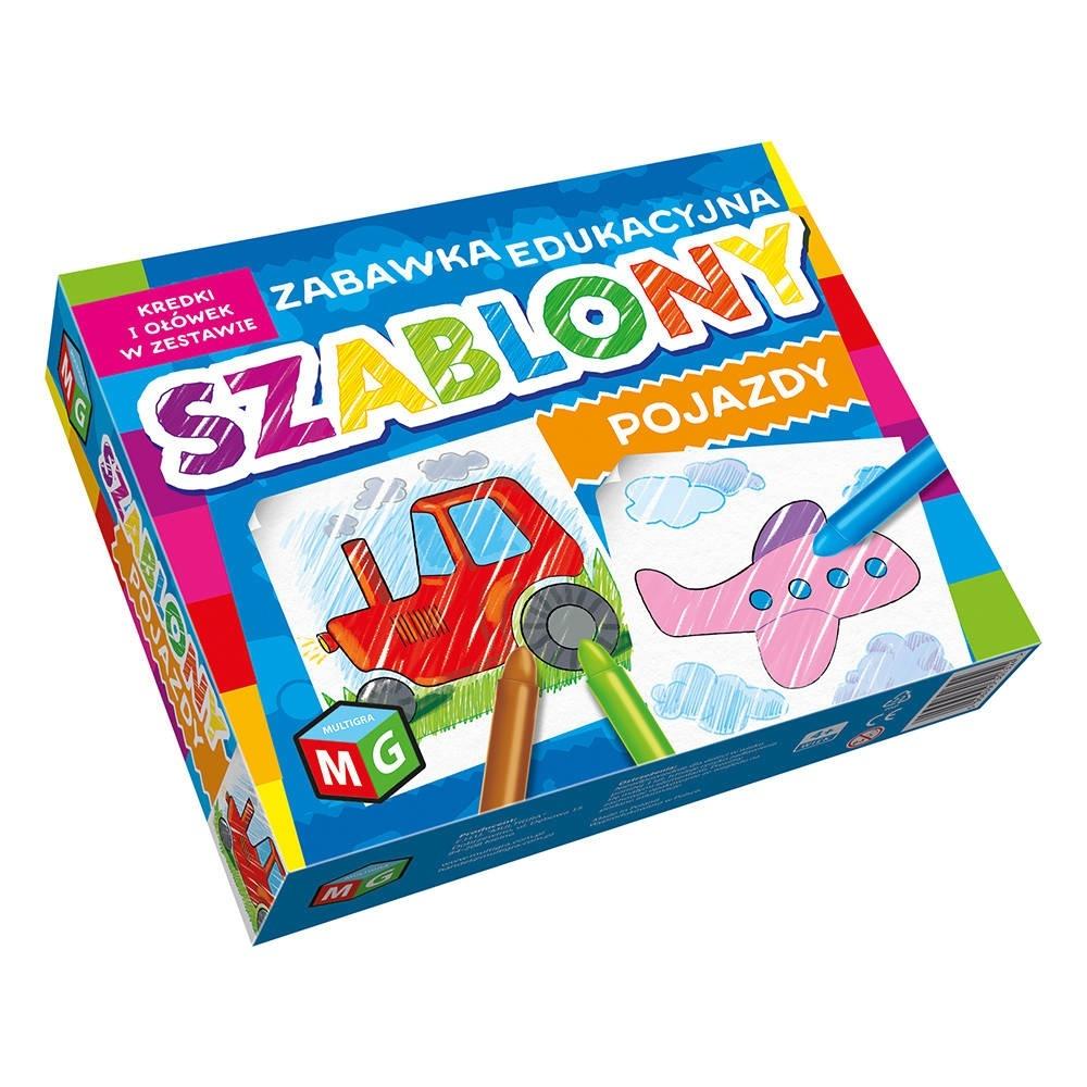 W zestawie znajdują się szablony, które umożliwiają łatwe i szybkie narysowanie konturu 8 różnych pojazdów. Można to zrobić wykorzystując szablon z konturem zewnętrznym lub wewnętrznym. Kontur należy rysować ołówkiem, według szablonu ułożonego na kartce papieru z załączonego do zestawu bloczka. Narysowane sylwetki można dowolnie pokolorować znajdującymi się w pudełku kredkami. Aby rysunek był w pełni ukończony, dziecko powinno domalować tło i wzbogacić rysunek wymyślonymi przez siebie szczegółami. Zestaw zawiera: szablony/ pozytyw - 8szt, szablony/ negatyw - 8szt, zestaw kredek, ołówek -1szt, bloczek - 1szt, instrukcję.