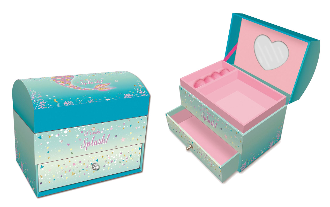 Kartonowa szkatułka z lusterkiem na wieczku, przegródką na pierścionki i wysuwaną szufladką.