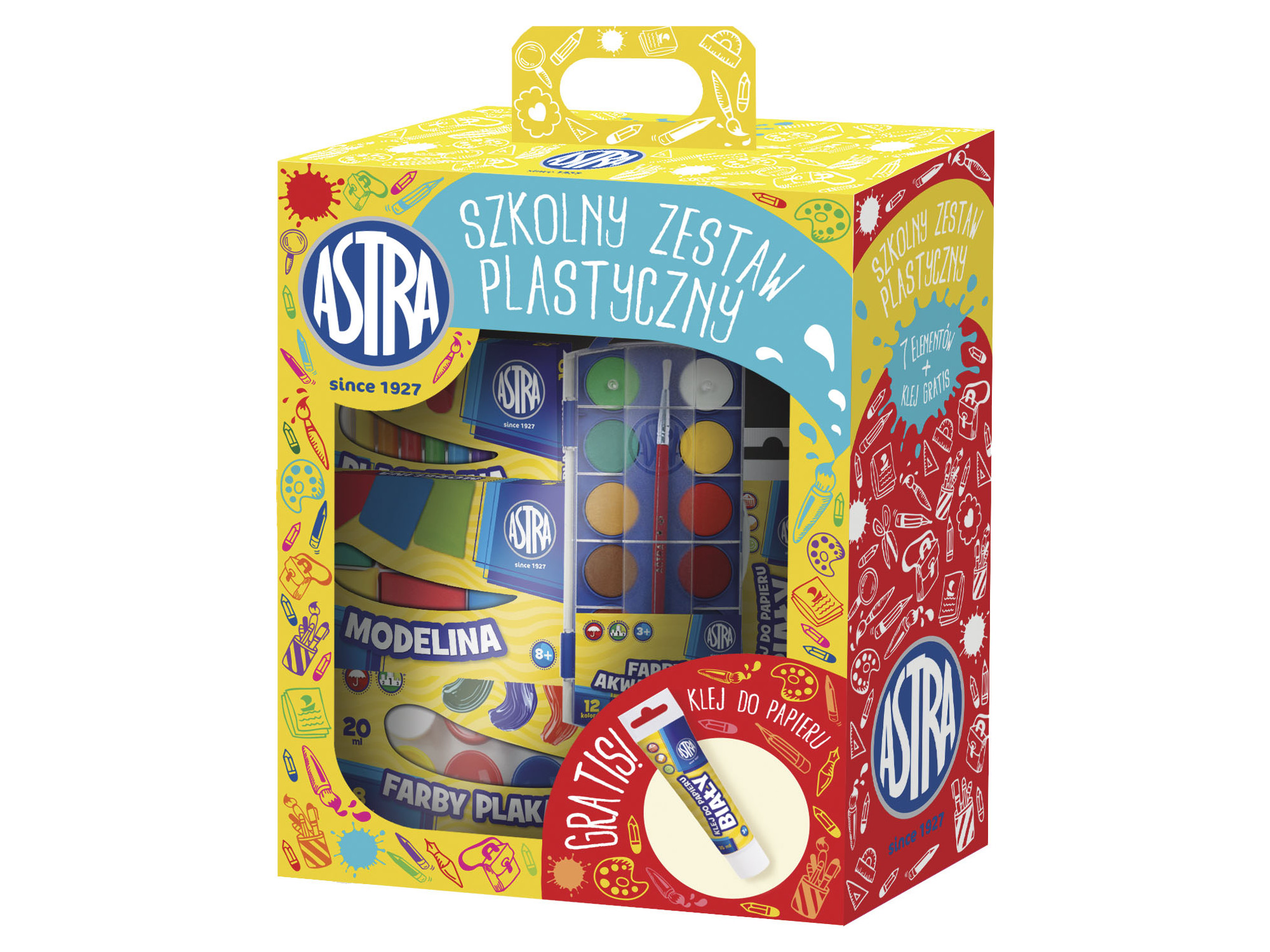 Szkolny zestaw plastyczny zawiera:- farby plakatowe 8 kolorów a 10ml- kubeczek z blokadą wylania- plastelina 10 kolorów- plastelina fluorescencyjna 6 kolorów- farby akwarelowe 12 kolorów- modelina 6 kolorów- pędzle szkolne z naturalnego włosia nr 2,6,12- klej do papieru