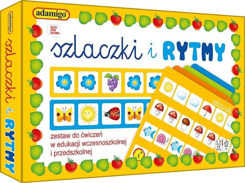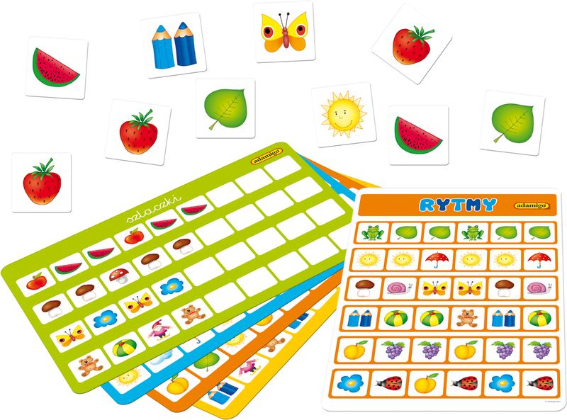 Należy dokończyć na planszy szlaczki wg wzoru. Zabawa może być bardziej kreatywna: układanie szlaczków według własnego pomysłu. Możliwości są nieograniczone: można tworzyć sekwencje powtarzających się 2, 3, 4 lub wielu elementów, układając długie wzory na stole lub podłodze. Druga strona plansz zawiera propozycje rytmów. Zadaniem gracza jest odnalezienie algorytmu i odtworzenie poprawnego ciągu obrazków na stole. Ćwiczenia wyrabiają spostrzegawczość i zdolności przyporządkowania liniowego, zachęcają do kreatywności oraz logicznego myślenia.