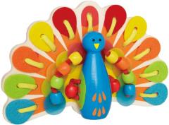 Sznurówki dodają jeszcze więcej kolorów temu dumnemu pawiowi. Nazwij kolory pawia. Licz otwory w czasie kiedy dziecko sznuruje.