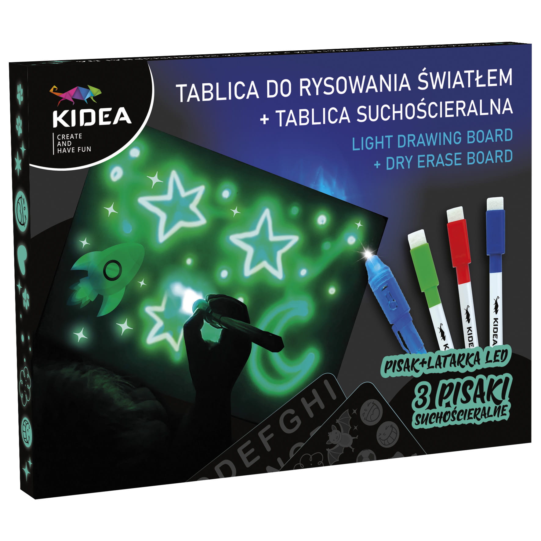 Opis produktuZasady bezpieczeństwaTablica do rysowania światłem oraz tablica suchościeralna (z drugiej strony) idealnie sprawdzi się podczas nauki rysowania oraz pisania. Dołączone do zestawu 3 pisaki suchościeralne o kolorze - zielonym, niebieskim, pomarańczowy i czerwonym umożliwiają tworzenie efektownych obrazków na tablicy suchościeralnej. Natomiast pisak z latarką LED UV (zasilany bateriami LR41 w zestawie) pozwoli na kreatywne zabawy na tablicy do rysowania światłem. Dodatkowo zestaw został wyposażony w 2 tablice z szablonami do odrysowania, które pozwalają tworzyć niezwykłe rysunki, nawet dziecku, które dopiero zaczyna przygodę z plastyką. x