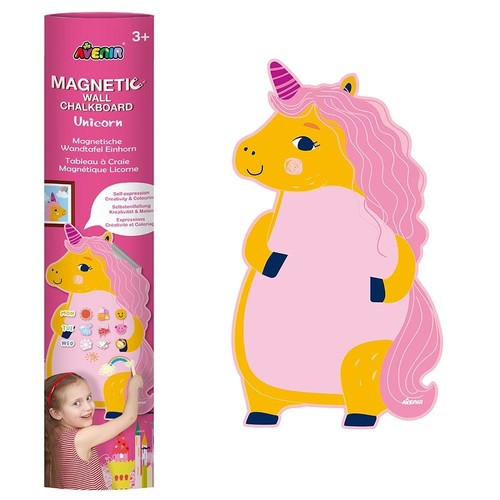 Tablicę można łatwo zamocować na ścianie albokażdej gładkiej powierzchni. Dołączone do zestawu cyferki i literki pozwolą dziecku na naukę czytania, a magnetyczne trójkąty na zabawę w tangram. Specjalnemagnesy w kształcie przedmiotów znanych dziecku z codziennego życia pozwoli naułożenie planu dnia lub zabawy w dopasowywanie przedmiotów i czynności do porydnia. Po tablicy można również pisać i rysować kredą. Urocza tablica magnetyczna w kształcie jednorożca mawymiary około 62 x 35 cm. W zestawie: - magnetycznatablica - 4 kawałki zmywalnej kredy - gąbka - 8 arkuszy wielorazowychnaklejek - 50 magnetycznych naklejek Wiek: 3+ x