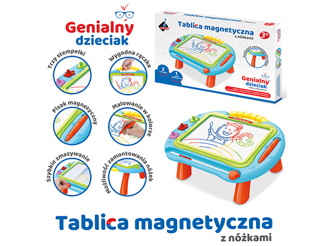 Opis produktuZasady bezpieczeństwaZabawa w rysowanie na tablicy magnetycznej rozwija motorykę małej ręki oraz pobudza wyobraźnię malucha. Dodatkowo w zestawie 3 stempelki o różnych kształtach - kółko, gwiazdka i rączka.Pisak do rysowania jest lekki i dopasowany do małych rączek. Do tablicy można zamontować nóżki - z przodu krótsze, z tyłu dłuższe.Wiek: 3+ Wymiary tablicy: 38.5 x 30 cm Wysokość z nóżkami 19 cm Wymiary opakowania: 48x4.5x30 cm x