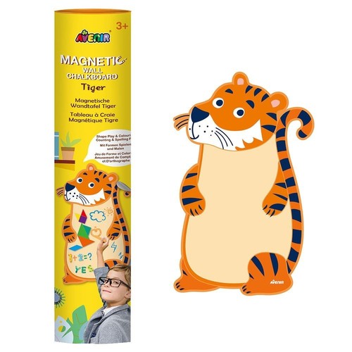 Tablicę można łatwo zamocować na ścianie albo każdej gładkiej powierzchni. Dołączone do zestawu cyferki i literki pozwolą dziecku na naukę czytania, a magnetyczne trójkąty na zabawę w tangram. Specjalne magnesy w kształcie przedmiotów znanych dziecku z codziennego życia pozwoli na ułożenie planu dnia lub zabawy w dopasowywanie przedmiotów i czynności do pory dnia. Po tablicy można również pisać i rysować kredą. Urocza tablica magnetyczna w kształcie tygryska ma wymiary około 58 x 36 cm. W zestawie: - magnetyczna tablica - 4 kawałki zmywalnej kredy - gąbka - 8 arkuszy wielorazowych naklejek - 43 magnetyczne naklejki (kształty, litery i cyfry) Wiek: 3+ x
