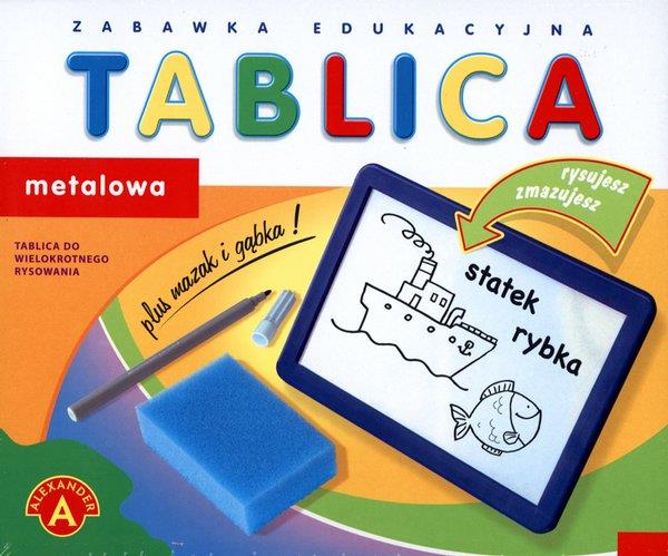 Tablica metalowa"" z mazakiem i gąbką, to zabawka dla przedszkolaków lubiących rysować, zaczynających naukę pisania i liczenia. Obie strony tablicy pokryte są emalią, dzięki czemu każdy rysunek i literka mogą być łatwo starte gąbką, a tablica będzie ponownie gotowa do rysowania. Dla dzieci w wieku od 5 lat.