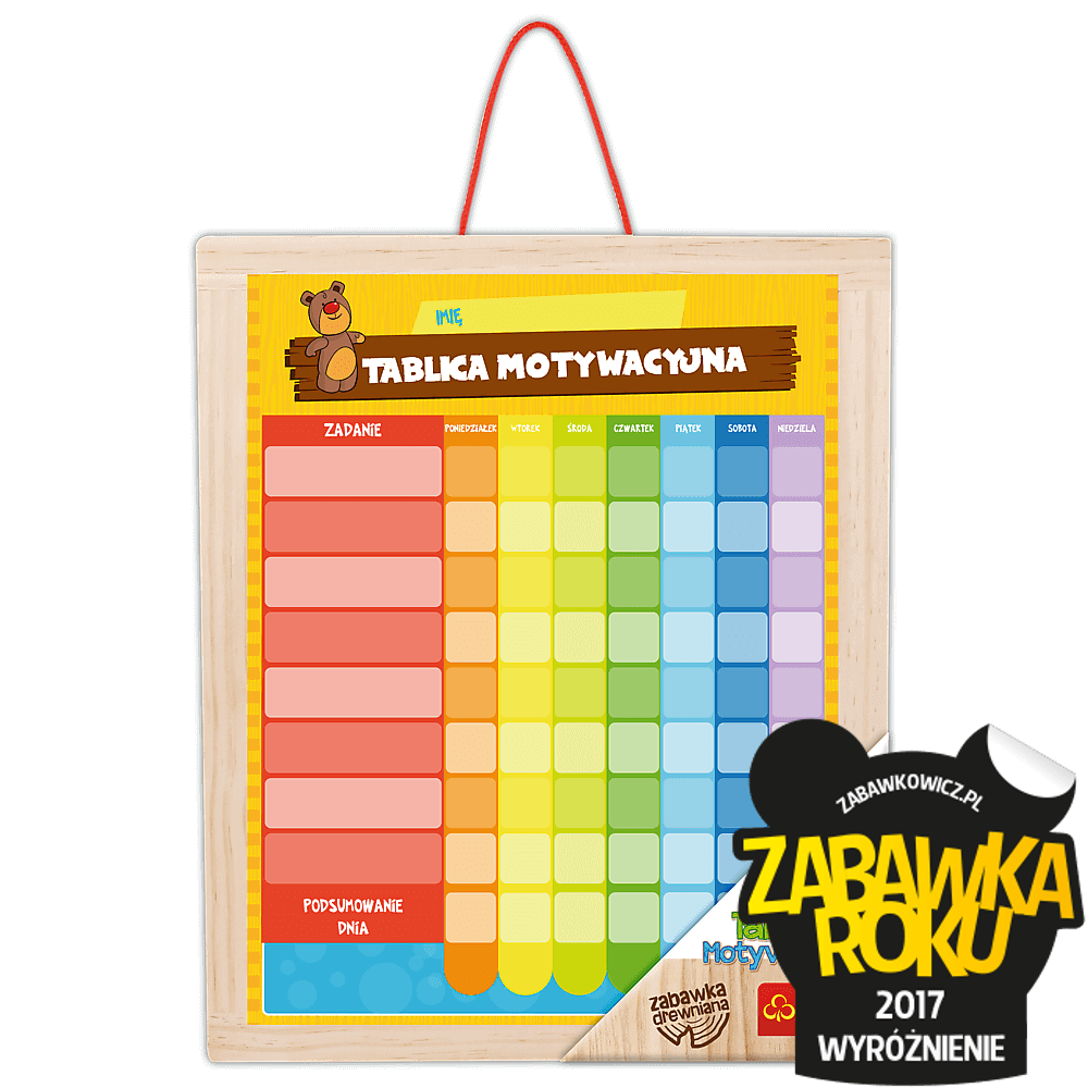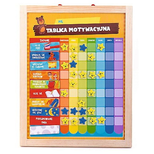 Kolorowa, wieloelementowa tablica wykonana z jasnego, naturalnego drewna jest doskonałą zabawką ogólnorozwojową, która zachęca do wspólnej nauki przez zasady dobrych praktyk Znakomite rozwiązanie dla dzieci od 3 roku życia Rozwija umiejętność współpracy oraz jest idealną zabawką do nauki nowych wyrazów, nazw dni tygodnia i kolorów od najmłodszych lat Tablica Motywacyjna z możliwością zawieszenia wyposażona jest w ponad 60 magnetycznych elementów, dzięki którym dziecko uczy się systematyczności wykonywanych działań Zabawka buduje relacje między opiekunami i dzieckiem, kształtuje dobre nawyki, a także wspiera w rozwoju intelektualnym dziecka, wspomagając jednocześnie zręczność i umiejętności manualne Wszystkie materiały wykorzystane do stworzenia zabawki posiadają atesty, a także zostały pomalowane nietoksycznymi farbami x