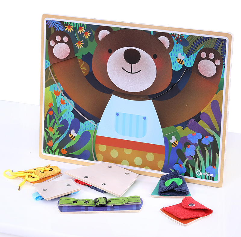 Tablica, która pomaga w ćwiczeniu takich umiejętności jak wiązanie sznurowadeł, zapinania zamka, guzika, napy czy paska.