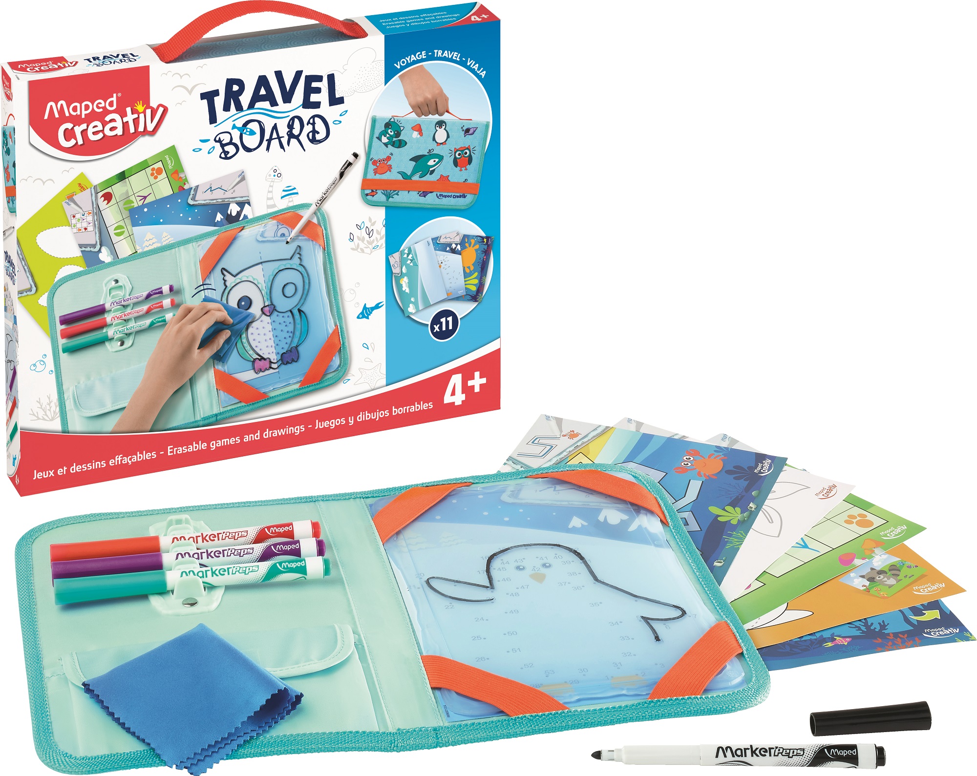 Zestaw kreatywny w materiałowej podróżnej teczce o wymiarach 23x29x3,3 cm. Zawiera przezroczystą tablicę, 4 markery w różnych kolorach, 11 obrazków do zabawy i ściereczkę do wycierania. Dla dzieci od 4 roku życia. x