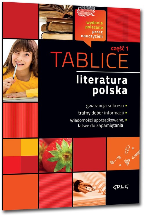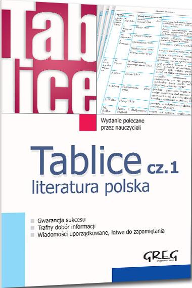 Tablice cz. 1 - literatura polska to pozycja skierowana jest zarówno do tych uczniów, którzy chcą uporządkować swoją wiedzę, jak i tych, którzy chcą ją zdobyć. Zawiera podział literatury na okresy literackie, charakterystykę poszczególnych epok, twórców i ich dzieł, prądów literackich, a także informacje z zakresu filozofii czy poszczególnych gatunków literackich. A wszystko to zwięźle ujęte na 123 stronach wzbogacone pomocnymi wytłuszczeniami, niezbędnymi kiedy chce się szybko znaleźć konkretną informację.Spis treściHISTORIA LITERATURYChronologia i periodyzacjaEpoki literackie - syntezaTwórcy i ich dziełaPrądy filozoficzneŚwiatopogląd, ideologiaPrzewodnie hasła...Prądy literackie w literaturze XIX i XX w.Bohater literacki - typyWzorce osobowe, sylwetka człowieka epokiRodzaje i gatunki literackieCHARAKTERYSTYCZNE CECHY EPOKIAntykKlasyfikacja mitówBiblia i mitologia - podobieństwa i różniceWybrane związki frazeologiczne rodem z mitologiiWybrane związki frazeologiczne rodem z BibliiŚredniowieczeZabytki języka polskiegoRenesansKryzys światopoglądowy w Trenach KochanowskiegoCechy tragedii antycznej i dramatu renesansowego w Odprawie posłów greckich J. KochanowskiegoTradycje antyczne w Pieśniach i Fraszkach J. KochanowskiegoMotywy renesansowe w Pieśniach i Fraszkach J. KochanowskiegoBarokŚrodki artystyczne typowe dla poezji barokowejOświecenieInstytucje polskiego oświeceniaRomantyzmEwolucja bohatera MickiewiczowskiegoPozytywizmRozwój techniki...Przyczyny zmian światopoglądowychRozwój czasopiśmiennictwaLiteratura tendencyjna, utylitaryzm w literaturzeModernizmCyganeria artystycznaWesele - symbolika postaci i przedmiotówKabarety20-lecie międzywojenneUgrupowania poetyckie w EuropieUgrupowanie poetyckie w PolsceUgrupowania artystyczne w Europie i w Polsce - zestawienie chronologiczneCzasopiśmiennictwoKabaretyLiteratura współczesnaPokolenia literackieWydarzenia polityczne i ich wpływ na literaturęWażne dzieła wydane na emigracjiPolskie instytucje kulturalne na obczyźnieKabaretyANEKSLaureaci literackiej Nagrody NoblaLaureaci nagrody Nike
