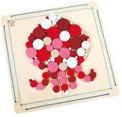 Drewniane kolorowe krążki, gotowy wzór i nitki do wyszycia ramki dokoła tabliczki pozwolą na stworzenie własnej kolorowej mozaiki w kształcie ośmiornicy.