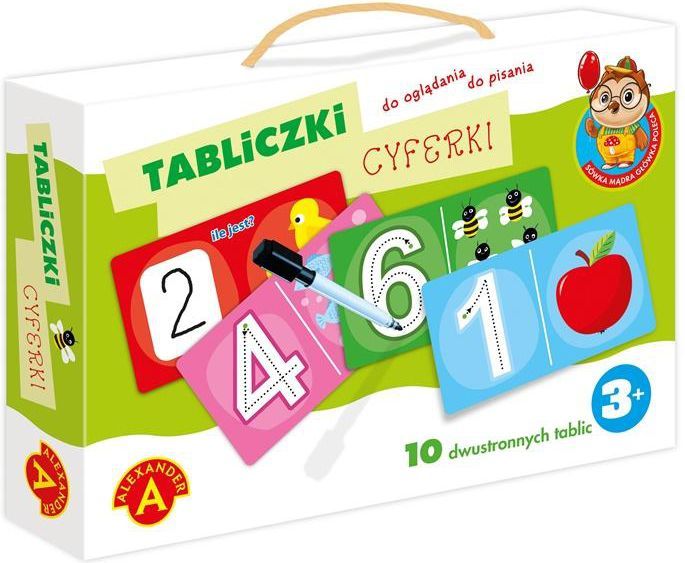 Tabliczki-cyferki to 10 dwustronnie ilustrowanych tabliczek, wykonanych z grubej i sztywnej tektury z foliowaną powierzchnią. Z jednej strony każdej tabliczki znajduje się biała cyfra z przerywaną linia ułatwiającą rysowanie jej kształtu. Obok znajduje się obrazek przedstawiający wartość cyfry. Na drugiej stronie tabliczki jest obrazek pokazujący wartość liczbową i białe pole, w które można wpisać odpowiednią dla niej cyfrę. Zabawka jest dobrym wstępem do poznania liczb, nauki liczenia i pisania.