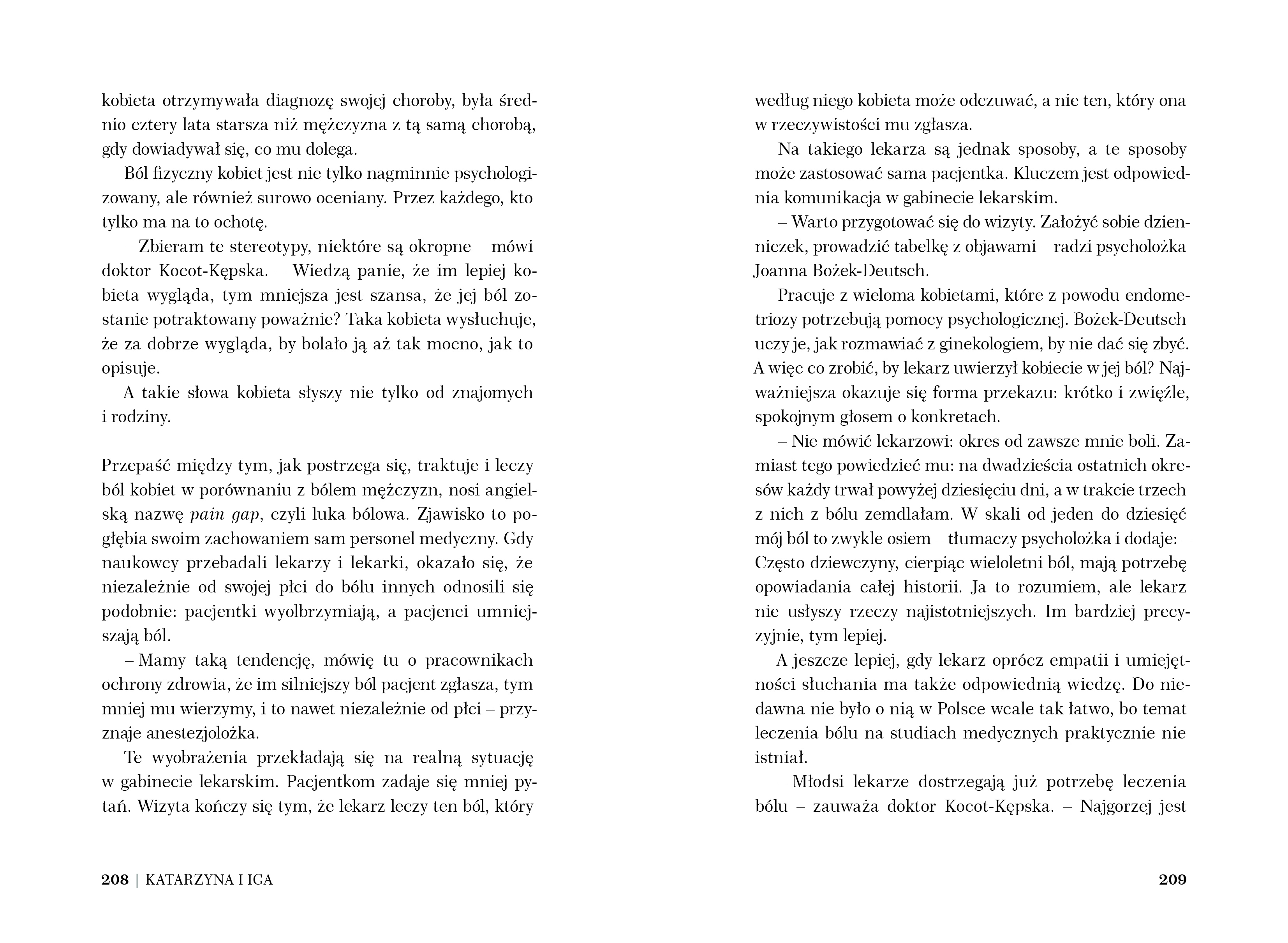 Opis produktuZasady bezpieczeństwa""Hipochondryczka, lekomanka, histeryczka i symulantka"" - słyszą kobiety chorujące na endometriozę od swojego otoczenia. ""Taka jest twoja uroda"" - mówią im lekarze. Panuje przekonanie, że cierpienie jest wpisane w kobiecość. Bóle miesiączkowe, porodowe - ot, taka kobieca natura. Nic się z tym nie da zrobić. Tak jest stworzony świat. A ta, która się na to nie zgadza, słyszy, że histeryzuje, dramatyzuje i przesadza. Paraliżujący ból, który uniemożliwia normalne funkcjonowanie. Obfite miesiączki, których nie da się zastopować. Choroba, którą trudno zdiagnozować. Leczenie, które się szpitalom nie opłaca. Błędy lekarskie, za które nikt nie chce wziąć odpowiedzialności. System leczenia, który nie istnieje. Prawie milion Polek cierpi na endometriozę. Potworny ból nie pozwala im normalnie żyć. Latami odbijają się od drzwi gabinetów lekarskich, próbując uzyskać właściwą diagnozę. Nie wierzy się w ich ból, bagatelizuje się go, a potem niewłaściwie i nieudolnie leczy. Tylko dlatego, że są kobietami. Magda Łucyan i Katarzyna Górniak, dziennikarki TVN-u, w rozmowach z endopacjentkami i lekarzami odkrywają prawdziwy obraz choroby, która jest w Polsce tak bezwstydnie ignorowana. Dobitnie pokazują, że cierpienie nie jest czyjąkolwiek urodą. Patricia Kazadi: Co się napłakałam i naklęłam, czytając książkę Taka twoja uroda - wiem tylko ja. Poruszające historie kobiet, bez tabu, tak w tym swoim bólu do bólu prawdziwe, podparte mądrze podanym i jakże potrzebnym kompendium wiedzy. Żałuję, że nie miałam takiej książki na początku swojej drogi z endometriozą. Wręczyłabym ją rodzinie, przyjaciołom czy mężczyznom w moim życiu. Żeby mogli, po prostu, zrozumieć. Moim zdaniem to obowiązkowa lektura nie tylko dla kobiet zmagających się z tą straszną chorobą, ale także ich otoczenia. Pomaga, uczy, oswaja, przestrzega i przeraża, by na końcu dać wsparcie i nadzieję. Jestem przekonana, że dla wielu endopolek będzie drogowskazem i da ukojenie. Tak jak dała je mi. Prof. Marzena Dębska: To niezwykle ważna i odważna książka, która wstrząsa świadomością na temat endometriozy. Autorki ukazują dramatyczne przeżycia kobiet, które borykają się z tą chorobą, cierpiąc nie tylko z powodu bólu, ale także powszechnej ignorancji i lekceważenia. Ta poruszająca lektura wywołuje również dyskusję na temat szkodliwych społecznych stereotypów dotyczących kobiecego ciała. Wciągająca, naszpikowana wiedzą, a jednocześnie głęboko przejmująca, pełna empatii i prawdy. Aga Szuścik: Ta książka to wzorowa reprezentacja polskich kobiet z endometriozą. Bez ogródek wyjawia trudy poszukiwań diagnozy, ukazuje zróżnicowanie poziomu polskiej ginekologii oraz prezentuje aktualną wiedzę medyczną. Przede wszystkim jednak wspiera i daje nadzieję - zarówno w chorowaniu, jak i w dążeniu do zmian systemowych. Przejmująca, prawdziwa, potrzebna. x