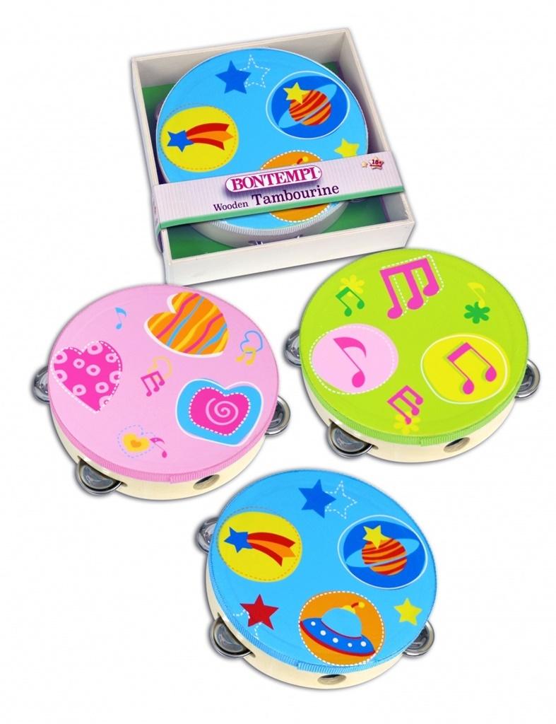 Drewniany tamburyn o wymiarach 18 x 18 x 4,5 cm zawierający 6 talerzy. Instrument jest trwały i wydaje realistyczne dźwięki. x