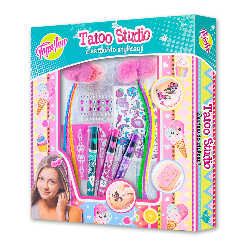 Opis produktuZasady bezpieczeństwaZestaw Tatoo Studio został stworzony dla wszystkich dziewczynek, które chcą być modę i lubią się wyróżniać. Zestaw zawiera: 2 dekoracyjne gumki do włosów z pomponem i kolorowymi warkoczykami, 3 metaliczne markery do tatuażu, 1 arkusz metalicznych tatuaży,1 arkusz szablonów do tatuażu, 1 arkusz naklejek kryształków. Produkt przeznaczony dla dzieci w wieku 8+. x