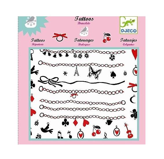 Zestaw tatuaży w formie bransoletek. Zestaw składa się z 2 arkuszy po 23 tatuaże. Tatuaże z łatwością można przenieść na skórę. Przetestowane dermatologicznie.Wiek: 4 - 12 lat. Wielkość opakowania: 21,5x23 cm