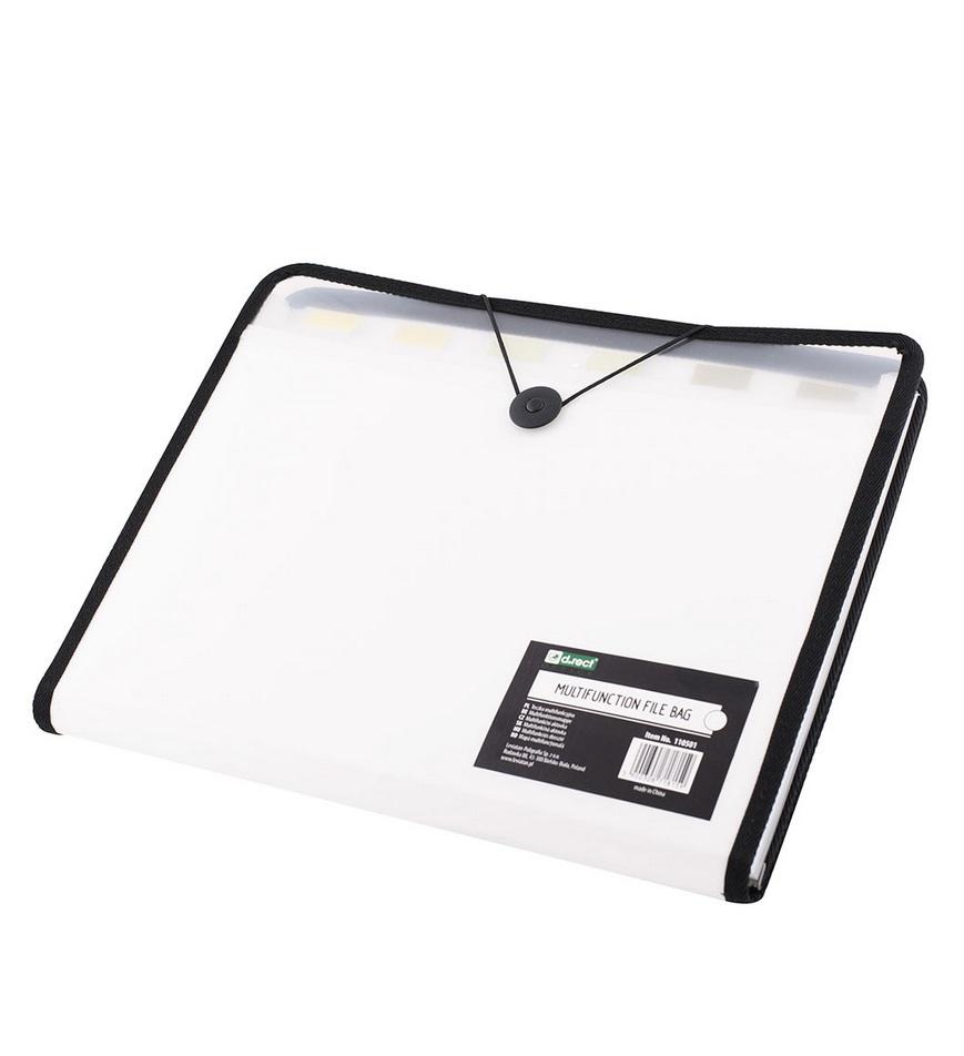 - 7 przeźroczystych przegródek z wymiennymi etykietami do opisu zawartości - uchwyt na długopis i kieszeń na wizytówki - wewnątrz notatnik A4 - oprawa z grubego PP 750 mic z transparentnym okienkiem - zamykana na gumkę - biała x