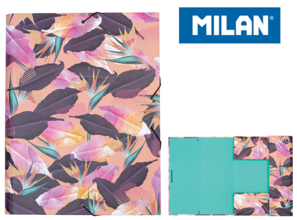 Folder w twardej oprawie zapinany na gumkę. Może pomieścić format A4 (33,5 x 26 cm) o grubości 3 cm, co odpowiada około 200 arkuszom. Matowe wykończenie z nadrukiem TROPICAL pasującym do kolekcji. Kolor wnętrza pasuje do koloru gumki.