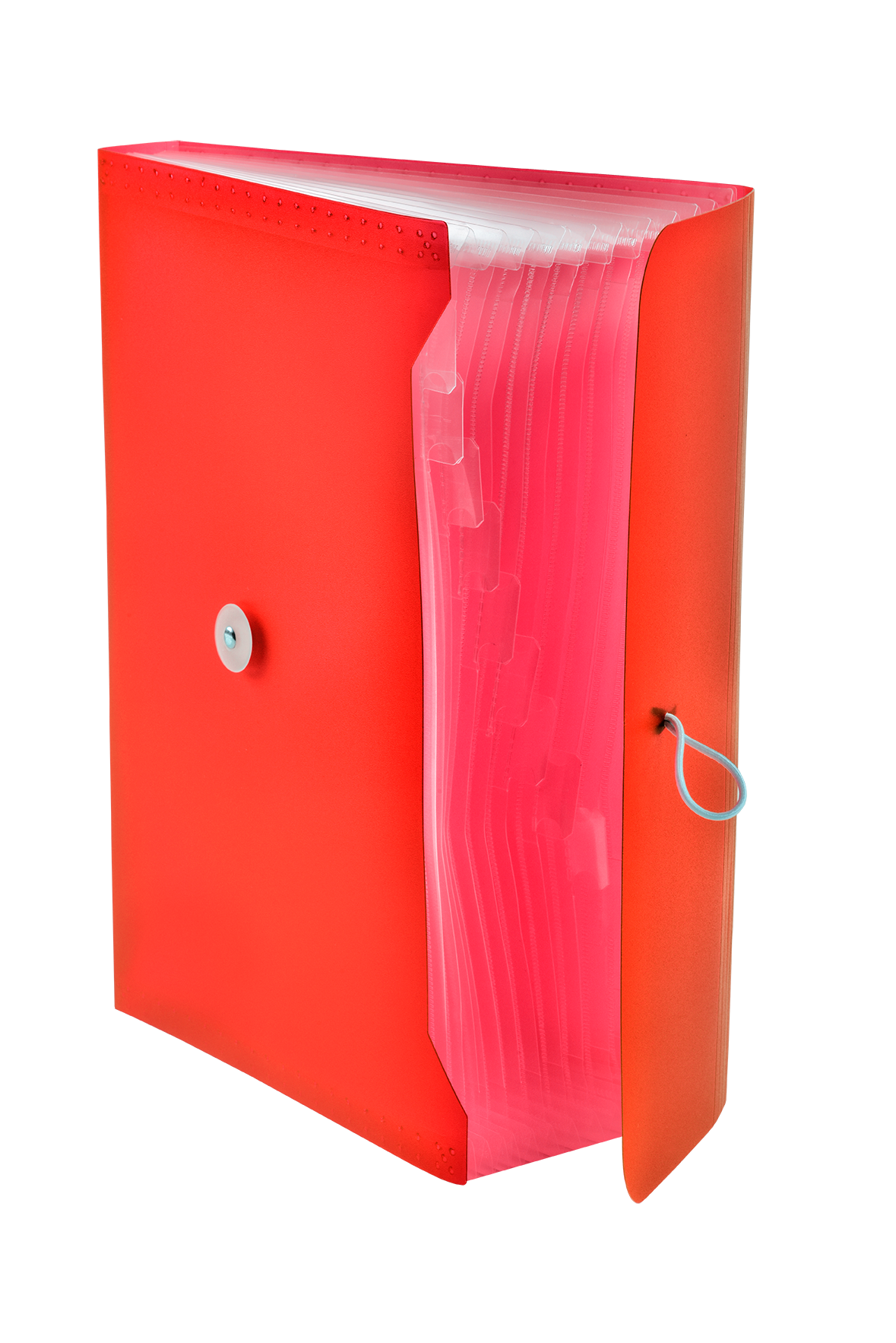 Teczka harmonijkowa PP z gumką, mieszcząca format A4. Teczka posiada 13 przegród. Wymiary teczki: 330x245x32 mm, grubość tworzywa PP: 0,60 mm. Dostępna w czterech kolorach (niebieski, czerwony, pomarańczowy, żółty). Opakowanie: folia 1 szt.