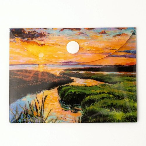 Ozdobna teczka kopertowa VISTA, wykonana z trwałego polipropylenu z nadrukiem w postaci impresjonistycznego widoku ujścia rzeki wpływającej do jeziora. Zamykana na zatrzask typu napa. Dzięki pełnemu zadrukowi, zawartość teczki pozostaje niewidoczna na zewnątrz. Idealne rozwiązanie do przechowywania dokumentów lub niewielkich płaskich przedmiotów.