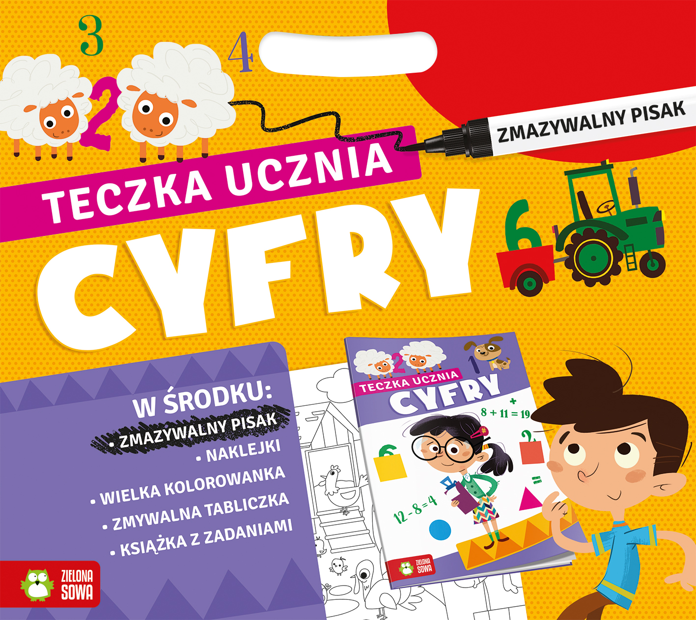Teczka ucznia. Cyfry"" W środku znajdziesz: Lakierowaną książeczkę do nauki matematyki, po której możesz pisać bez obawy, że popełnisz błąd. Pomyłkę zawsze można wytrzeć! Magiczny zmazywalny pisak. Zmywalną tabliczkę, na której możesz ćwiczyć pisanie cyfr oraz dodawanie i odejmowanie lub pisać na niej co tylko ci się zamarzy. Wielką kolorowankę, by zabić nudę. Naklejki, by ozdabiać nimi kolorowankę lub co tylko zechcesz. x