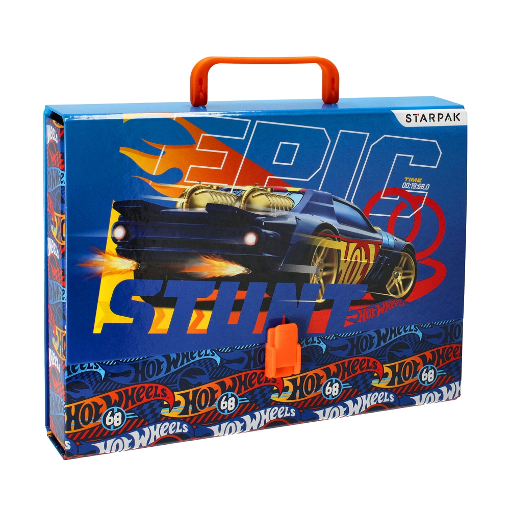 Teczka z grubego, lakierowanego kartonu, zamykana klipsami, wyposażona w solidną rączkę, wzmocniona metalowymi nitami. Idealna na zajęcia pozaszkolne. Ozdobiona wizerunkiem Hot Wheels.
