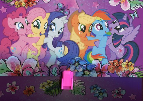 Teczka z rączką do przenoszenia i przechowywania dokumentów, pomocy dydaktycznych czy prac plastycznych. Wykonana jest ze sztywnej tektury oklejonej z dwóch stron elegancką okleiną i polakierowanej. Grafika odzwierciedla motywy licencyjne My Little Pony. Rączka i zamek/zapięcie wykonane z plastiku, mix wzorów.
