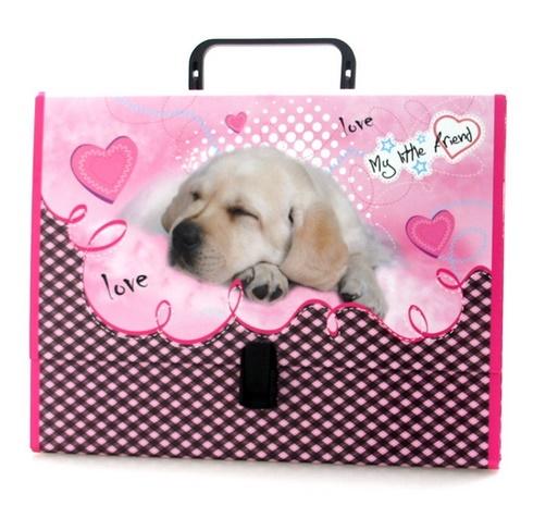 Teczka z rączką do przenoszenia i przechowywania dokumentów, pomocy dydaktycznych czy prac plastycznych. Wykonana jest ze sztywnej tektury oklejonej z dwóch stron elegancką okleiną i polakierowanej. Grafika odzwierciedla motywy licencyjne My Little Friend. Rączka i zamek/zapięcie wykonane z plastiku.