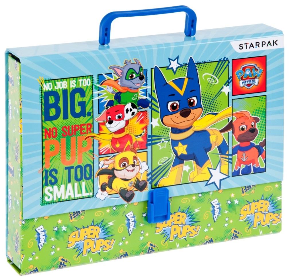 Sztywna teczka wykonana z grubego, lakierowanego kartonu, zamykana na dwa metalowe klipsy, wyposażona w solidną rączkę, wzmocniona metalowymi nitami. Idealna na zajęcia pozaszkolne i przechowywanie prac dziecka.
