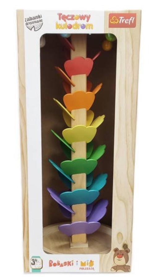 Tęczowy Kulodrom to wysokiej jakości zabawka wykonana z naturalnego drewna. Kolorowy tor składa się z płatków we wszystkich kolorach tęczy! Zabawka drewniana rozwija wyobraźnię przestrzenną oraz uczy koncentracji. W zestawie znajduje się 5 kolorowych kuleczek, które wydają przyjemne dźwięki odbijając się od płatków. Tęczowy Kulodrom wspomaga naukę kolorów oraz rozwija zdolność logicznego myślenia. Doskonała zabawka dla dzieci od 3 roku życia!