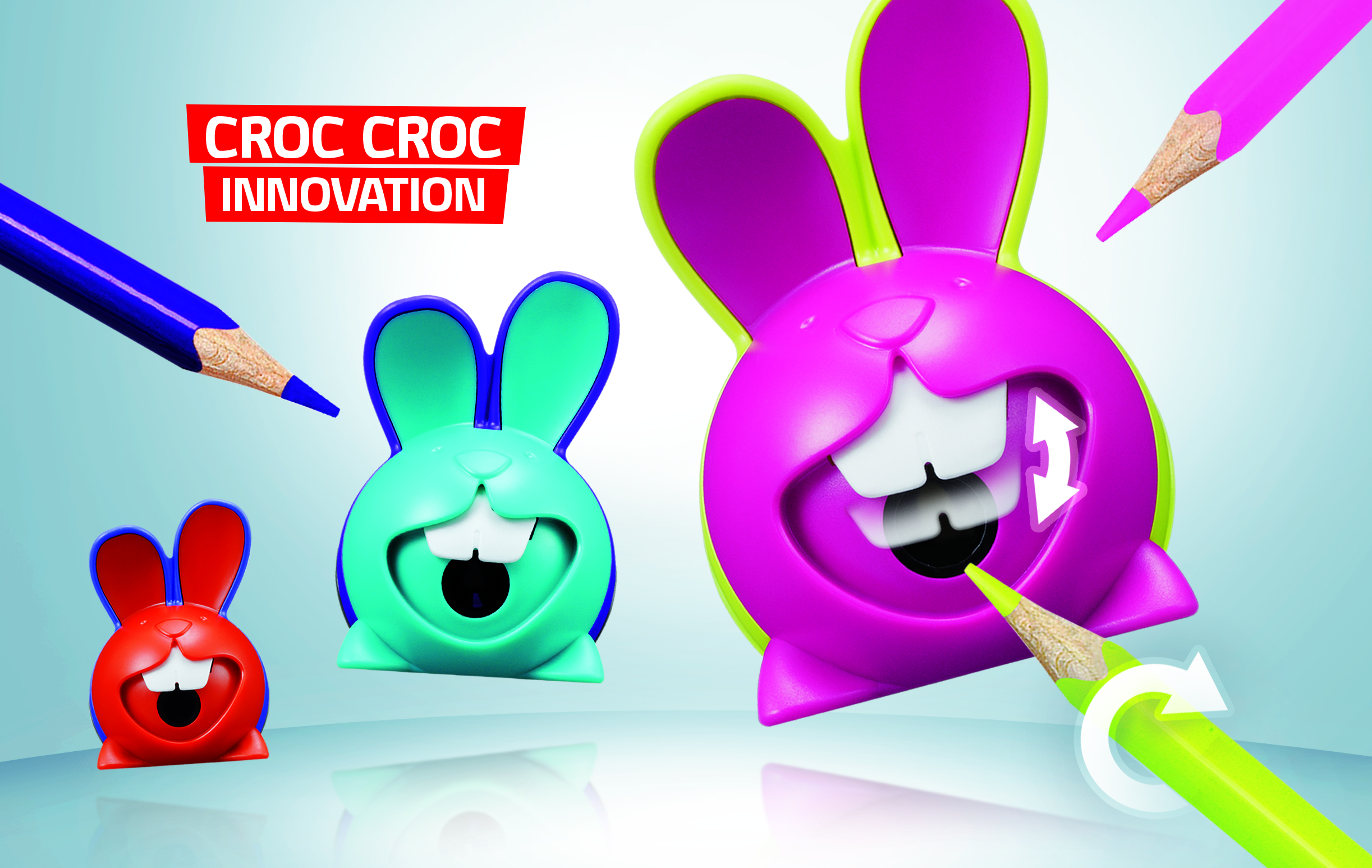Temperówka CROC CROC INNOVATION w kształcie króliczka - doskonały interaktywny towarzysz w szkolnej ławie. Temperowane kredki i ołówki wprawiają w ruch białe ząbki. Trzy wersje kolorystyczne: niebiesko-granatowy, zielono-różowy i czerwono-granatowy.