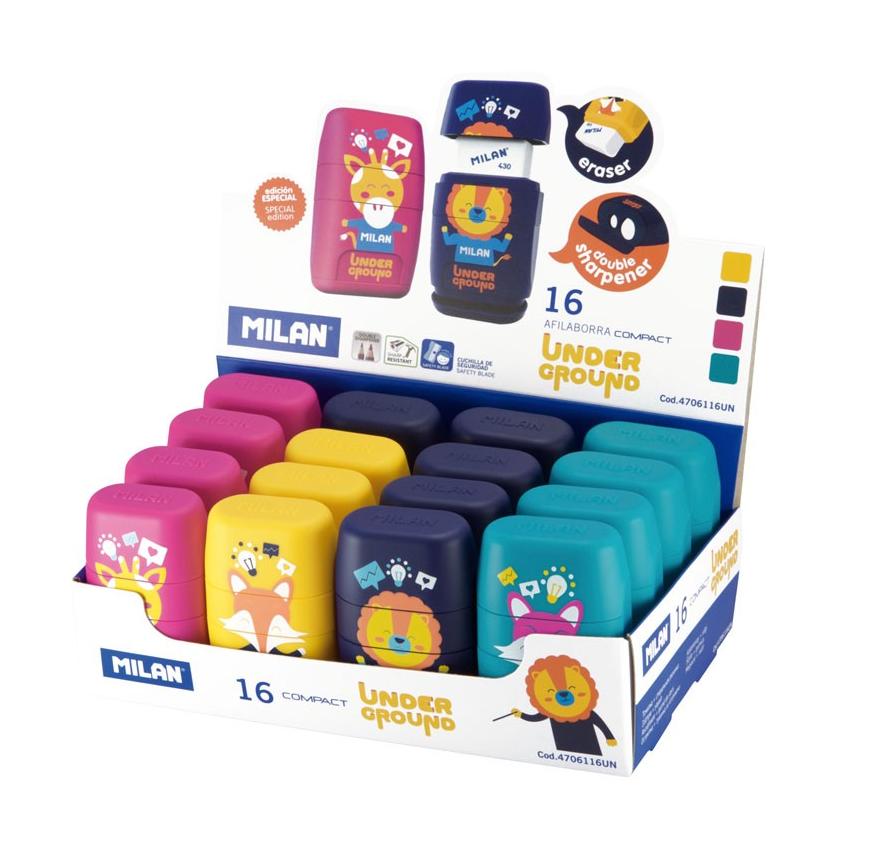Z jednej strony podwójna temperówka z bezpiecznym ostrzem ze stali węglowej. Z drugiej miękka gumka syntetyczna, a po środku pojemnik na ścinki. Wszystko w żywych kolorach i nowoczesnym designie nawiązującym do kolekcji UNDERGROUND.