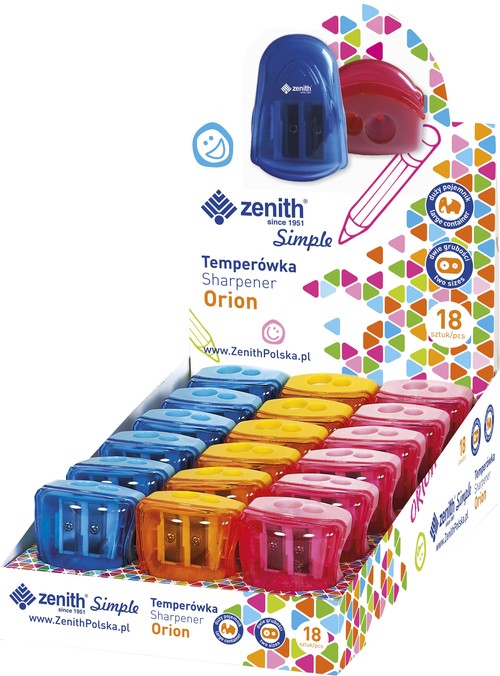 Temperówka Zenith z dwoma otworami i dużym pojemnikiem Orion. Display 18 sztuk, mix kolorów.