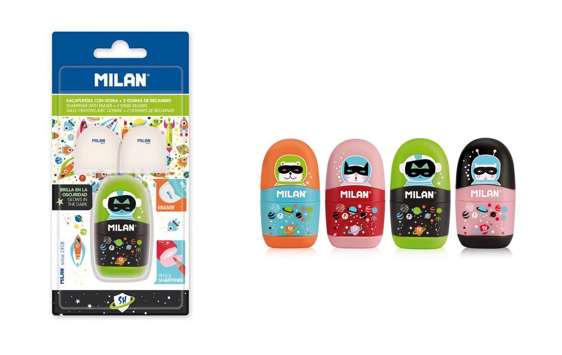 Fantazyjne połączenie temperówki i gumki w jednym. Z jednej strony pojedyncza temperówka z bezpiecznym ostrzem ze stali węglowej. Z drugiej miękka gumka syntetyczna, a po środku pojemnik na ścinki. Wszystko w żywych kolorach i nowoczesnym designie z kolekcji SUPER HEROES SPACE. NOWOŚĆ: elementy fluorescencyjne świecące w ciemności. Dodatkowo 2 miękkie gumki syntetyczne do ścierania większości rodzajów grafitu z każdego rodzaju papieru.