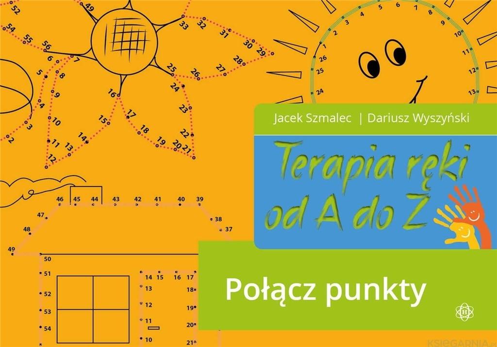 Połącz punkty to czwarta część zestawu Terapia ręki Składa się z 14 kart z ćwiczeniami. Zadaniem dziecka jest łączenie punktów w kolejności, zaczynając od tego oznaczonego cyfrą 1. Dziecko na początku może tylko wskazywać palcem poszczególne cyfry i liczby, a następnie przy użyciu mazaka, pisaka, ołówka, kredki może połączyć wszystkie kropki ze sobą. Połączone punkty utworzą obrazek, który maluch może pokolorować. Celem ćwiczenia jest kształtowanie prawidłowej postawy, polepszenie chwytu u dziecka, poprawa koordynacji wzrokowo-ruchowej, dostosowanie siły chwytu do narzędzia pisarskiego, poprawa rotacji w przedramieniu oraz usprawnienie wyizolowanych ruchów palców, a także doskonalenie liczenia, kształtowanie wyobraźni oraz poszerzanie słownictwa. x