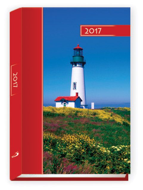 Terminarz na rok 2017, papier chamois, druk wnętrza w dwóch kolorach, perforowane narożniki kartek, tasiemka, każdy dzień na oddzielnej stronie, imieniny, święta, patron dnia, informacja o liturgii dnia, wschód-zachód słońca, fazy księżyca, myśl na każdy dzień, terminarz spotkań, miejsce na notatki, skrócone kalendarium miesiąca bieżącego, miejsce na adresy i telefony.