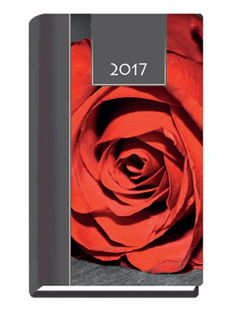 Terminarz tygodniowy na rok 2017, papier chamois, druk wnętrza w dwóch kolorach, perforowane narożniki kartek, tasiemka, tydzień na dwóch stronach, imieniny, święta, patron dnia, informacja o liturgii dnia, myśl na każdy tydzień, miejsce na notatki, skrócone kalendarium miesiąca bieżącego.