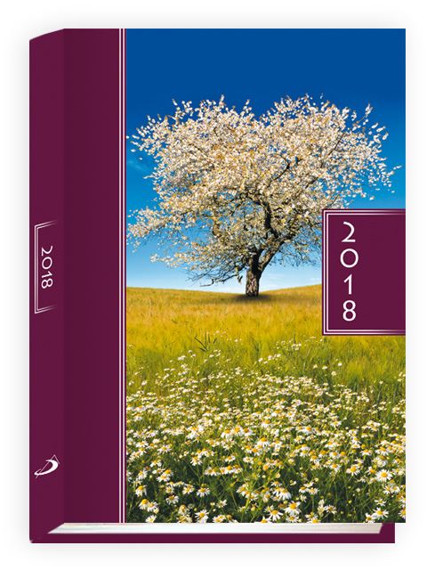 Terminarz na rok 2018, papier chamois, druk wnętrza w dwóch kolorach, perforowane narożniki kartek, tasiemka, każdy dzień na oddzielnej stronie, imieniny, święta, patron dnia, informacja o liturgii dnia, wschód-zachód słońca, fazy księżyca, myśl na każdy dzień, terminarz spotkań, miejsce na notatki, skrócone kalendarium miesiąca bieżącego, miejsce na adresy i telefony.