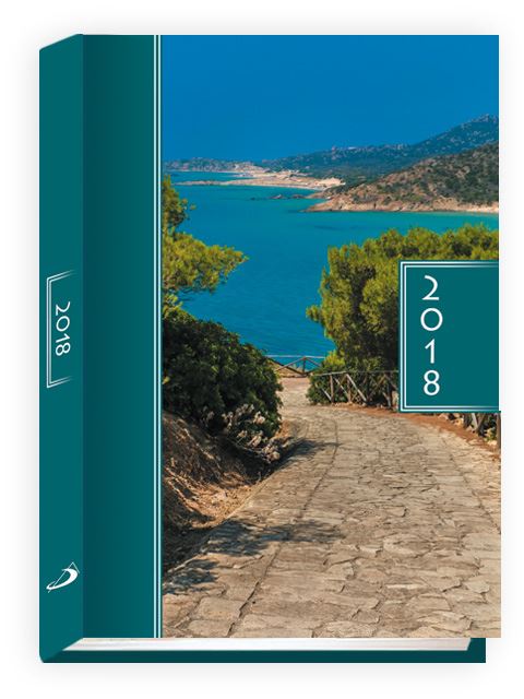 Terminarz na rok 2018, papier chamois, druk wnętrza w dwóch kolorach, perforowane narożniki kartek, tasiemka, każdy dzień na oddzielnej stronie, imieniny, święta, patron dnia, informacja o liturgii dnia, wschód-zachód słońca, fazy księżyca, myśl na każdy dzień, terminarz spotkań, miejsce na notatki, skrócone kalendarium miesiąca bieżącego, miejsce na adresy i telefony.