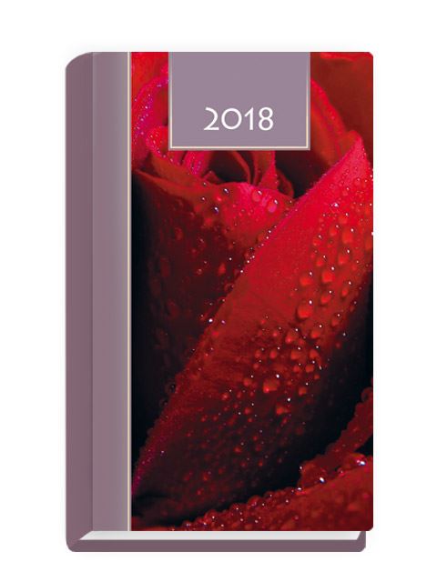 Terminarz tygodniowy na rok 2018, papier chamois, druk wnętrza w dwóch kolorach, perforowane narożniki kartek, tasiemka, tydzień na dwóch stronach, imieniny, święta, patron dnia, informacja o liturgii dnia, myśl na każdy tydzień, miejsce na notatki, skrócone kalendarium miesiąca bieżącego, skrócone kalendarium na kolejny rok.