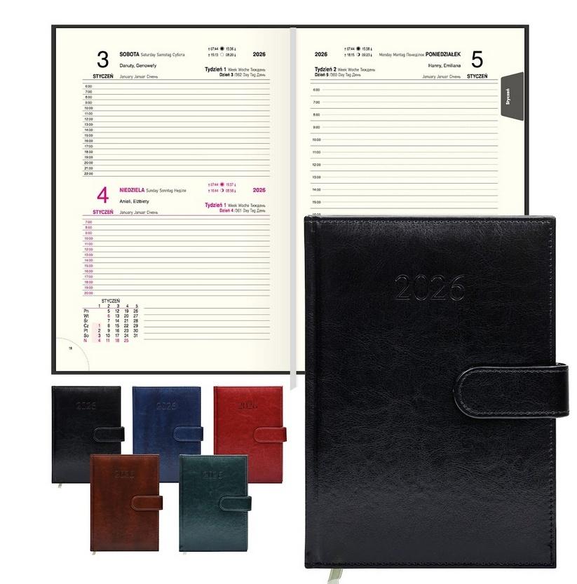 Opis produktuZasady bezpieczeństwa- Format A5 (140x207x22 mm) - Ilość stron: 352 - Dostępne kolory: czarny, granatowy, bordo, zielony, brąz - Oprawa: twarda skóropodobna + gąbka (okleina termoprzebarwialna) - Pasek na magnes - Perforowane rogi - Registry wycinane - Układ środka: dzień na stronie ( sobota niedziela na 1 stronie) - Wewnątrz tasiemka do oznaczania stron ułatwia odnajdywanie ważnych notatek lub ostatnio zapisanej strony - Papier: 70 g/m2 w kolorze ecru - Kalendarium: w języku polskim, angielskim, numeracja dni i tygodni, podwójne imieniny - Część informacyjna: strony na notatki, telefony kierunkowe, skorowidz alfabetyczny, daty imienin i Świąt.