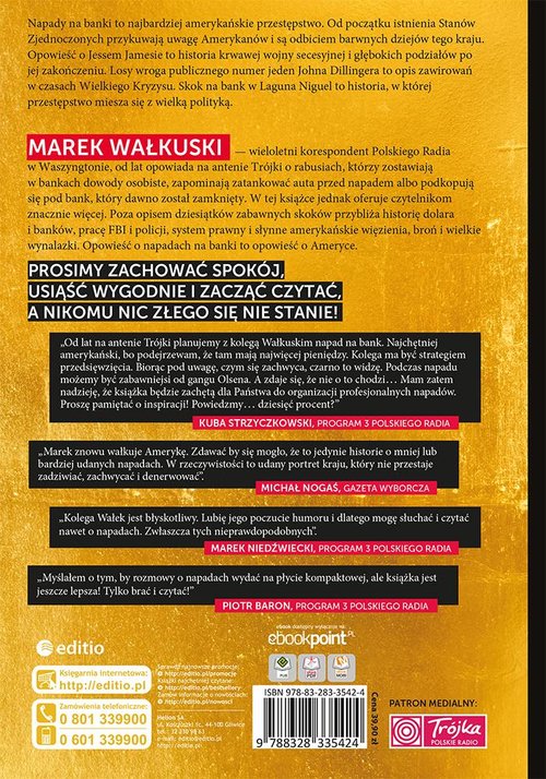 Opis produktuZasady bezpieczeństwaNapady na banki to najbardziej amerykańskie przestępstwo. Od początku istnienia Stanów Zjednoczonych przykuwa ono uwagę Amerykanów i jest odbiciem barwnych dziejów tego kraju. Opowieść o Jessem Jamesie to historia krwawej wojny secesyjnej i głębokich podziałów po jej zakończeniu. Losy wroga publicznego numer jeden Johna Dillingera to opis zawirowań w czasach Wielkiego Kryzysu. Skok na bank w Laguna Niguel to historia, w której przestępstwo miesza się z wielką polityką. Marek Wałkuski, wieloletni korespondent Polskiego Radia w Waszyngtonie, od lat opowiada na antenie Trójki o rabusiach, którzy zostawiają w bankach dowody osobiste, zapominają zatankować auta przed napadem albo podkopują się pod bank, który został dawno zamknięty. W tej książce oferuje jednak czytelnikom znacznie więcej. Poza opisem dziesiątków zabawnych skoków, przybliża czytelnikowi historię dolara i banków, pracę FBI i policji, system prawny i słynne więzienia, broń i wielkie wynalazki. Opowieść o napadach na banki to opowieść o Ameryce. Prosimy zachować spokój, usiąść wygodnie i zacząć czytać, a nikomu nic złego się nie stanie ;) „Od lat na antenie Trójki planujemy z kolega Wałkuskim napad na bank. Najchetniej amerykanski, bo podejrzewam, ze tam maja najwiecej pieniedzy. Kolega ma byc strategiem przedsiewziecia. Biorac pod uwage, czym sie zachwyca, czarno to widze. Podczas napadu mozemy byc zabawniejsi od gangu Olsena. A zdaje sie, ze nie o to chodzi… Mam zatem nadzieje, ze ksiazka bedzie zacheta dla Panstwa do organizacji profesjonalnych napadów. Prosze pamietac o inspiracji! Powiedzmy… dziesiec procent?” KUBA STRZYCZKOWSKI, PROGRAM 3 POLSKIEGO RADIA „Marek znowu wałkuje Ameryke. Zdawac by sie mogło, ze to jedynie historie o mniej lub bardziej udanych napadach. W rzeczywistosci to udany portret kraju, który nie przestaje zadziwiac, zachwycac i denerwowac”. MICHAŁ NOGAS, GAZETA WYBORCZA „Kolega Wałek jest błyskotliwy. Lubie jego poczucie humoru i dlatego moge słuchac i czytac nawet o napadach. Zwłaszcza tych nieprawdopodobnych”. MAREK NIEDZWIECKI, PROGRAM 3 POLSKIEGO RADIA „Myslałem o tym, by rozmowy o napadach wydac na płycie kompaktowej, ale ksiazka jest jeszcze lepsza! Tylko brac i czytac!” PIOTR BARON, PROGRAM 3 POLSKIEGO RADIA x
